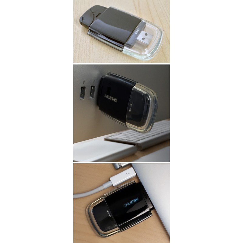 Se transporta fácilmente para su uso discreto en cualquier lugar. No requiere software. El logotipo iluminado de Q-Link indica que está encendido. La tapa del conector USB se retira con facilidad y puede ser almacenada en el otro extremo de la unidad mientras está en uso.